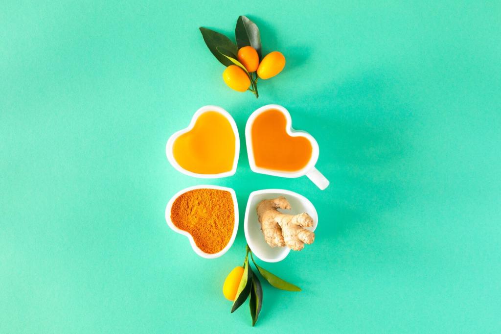 Ingwer wärmt und beruhigt, Kurkuma wirkt antioxidativ, Knoblauch unterstützt Abwehrkräfte. In Brühen entfalten sie sanfte Kraft. Erzähle uns, welche Gewürzkombinationen dir durch graue Tage helfen und weshalb.